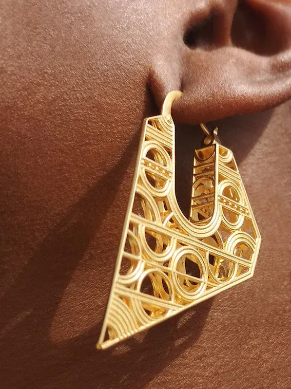 Sculptural trapeze earrings inspired by Yacouba face paintings.